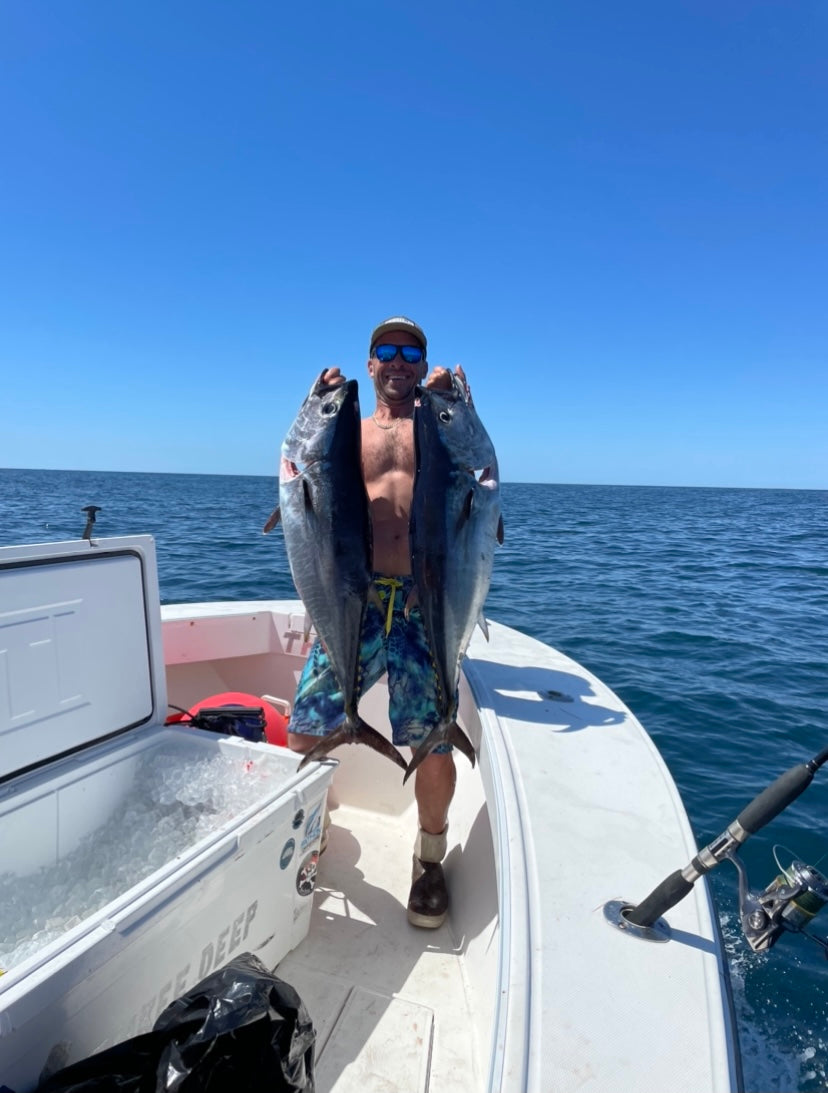 This weekend was exciting as the first wave of smaller bluefin finally showed up south of Montauk and Block Island! Multiple boats were able to get out with the beautiful weather we have been having and lots of smaller Bluefin were caught. Pictured here is Vinny from "Three Deep" with two nice bluefin for the table!