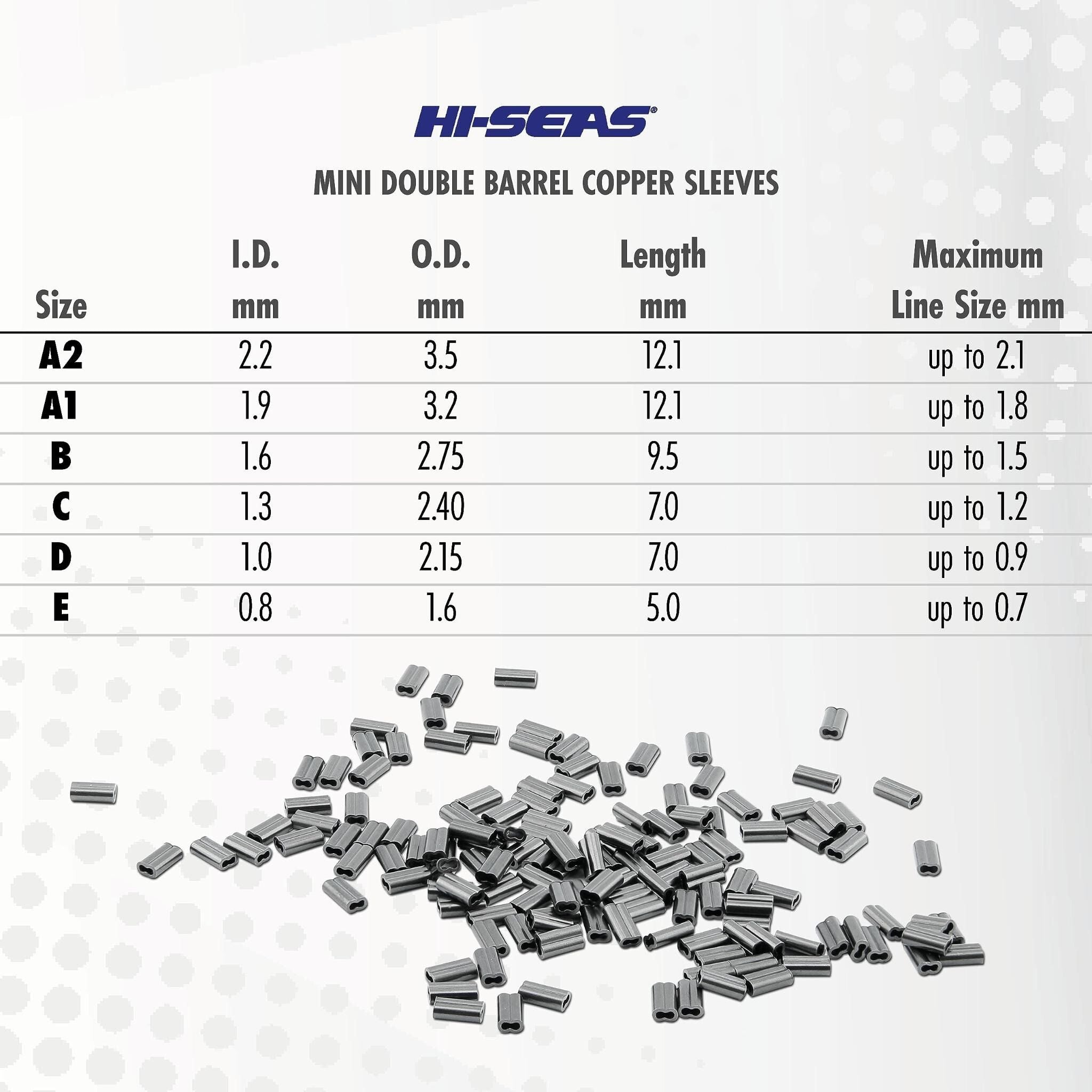 Mini Double-Barrel Sleeves, available in black finish copper, are excellent for use with big game mono leader material and can also be fitted to wire leader and other various lines. Burr-free nonabrasive finish combined with high strength and corrosion resistance makes HI-SEAS Sleeves the preferred choice of professional leader, lure, and tackle manufacturers.