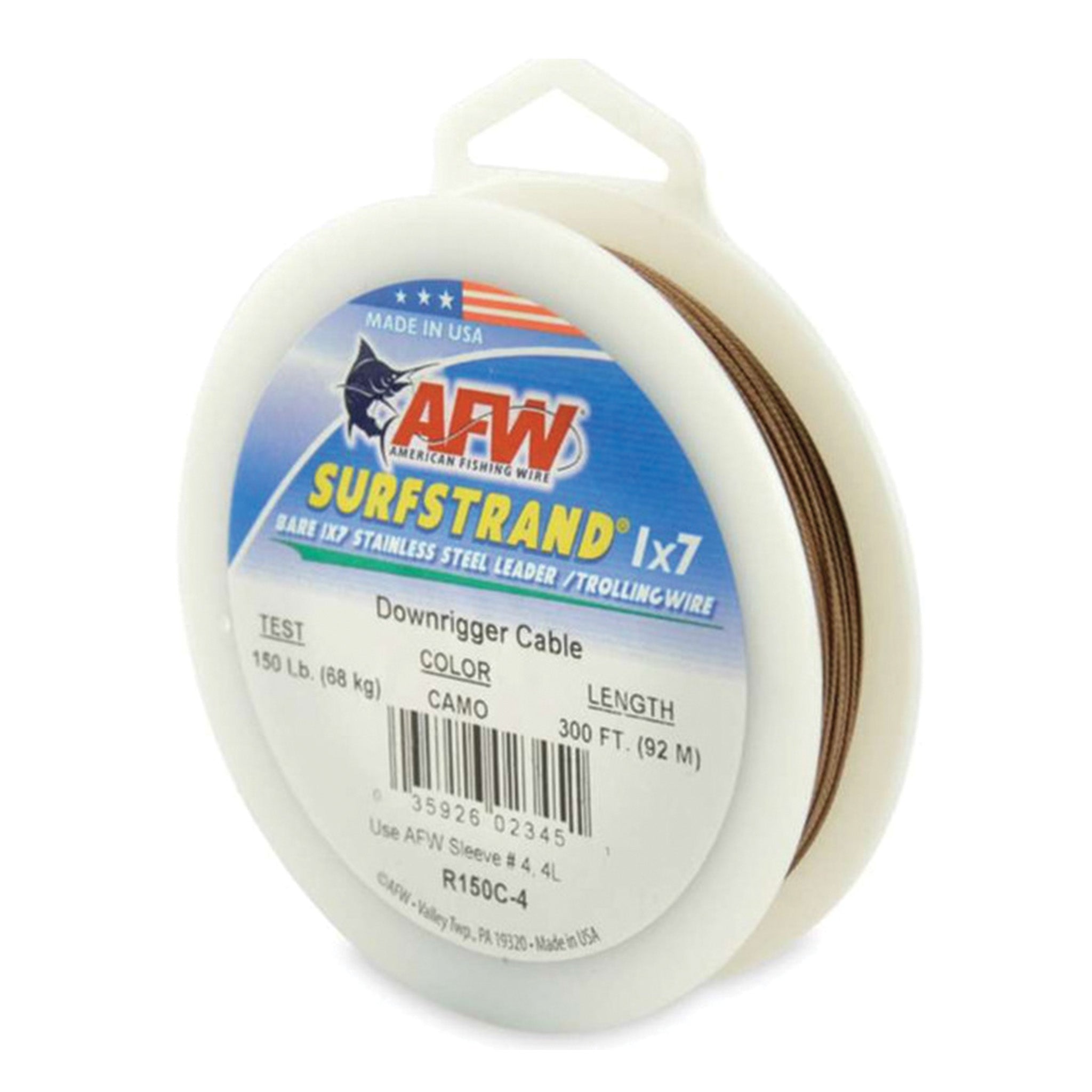 American Fishing Wire (AFW) Surfstrand is a 150lb 1X7 stainless cable. The Camo color reduces reflectivity in the water. This 300ft spools is the perfect length to fill downriggers for use in both fresh and saltwater. When rigging us AFW sleeve #4 or 4L
