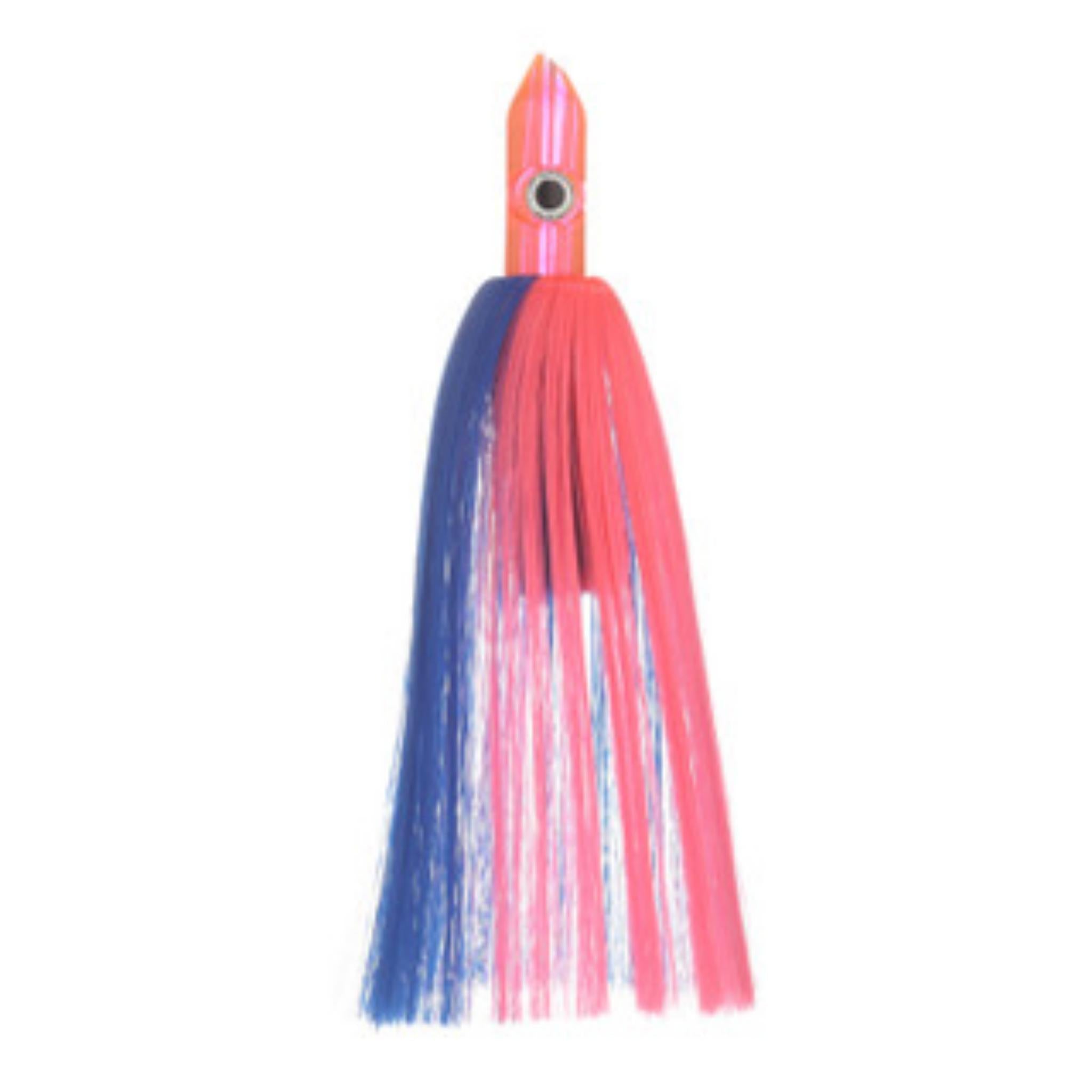 The Dredge Enticers are a dredge lure head designed to go in front of natural or artificial baits to provide more attraction to the dredge. These are made of a lightweight full size head with a wide, offset hole for slipping over pin rigs and keeping the lure upright. Heads are available in pink or blue and have eyes. Then each color head has 3 different color hair options. the hair is silky, shiny and firm. Dredge lure is 9" total length and comes shipped in a tube. These look great in front of a dredge FlapZ.  One of the most popular colors in the Atlantic.