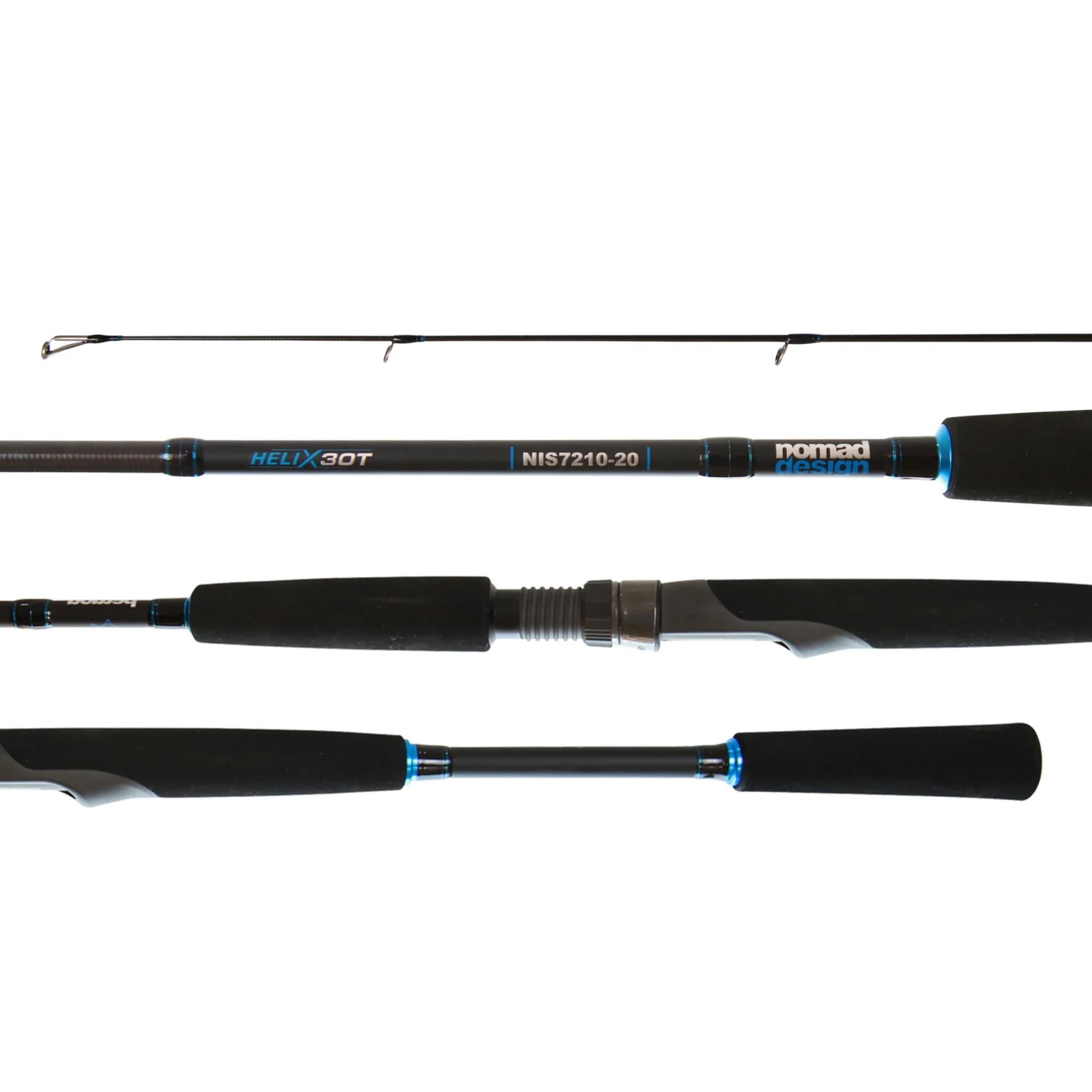 Achieving superior performance marks when used along any coastline, the Nomad Design Inshore Spinning Rods were designed for maximum performance in the world's most diverse inshore fishing grounds. This series of inshore rods was first developed by Nomad Design with lessons learned from over 20 years of fishing the shallow waters of Australia's Great Barrier Reef. While they were built for this incredibly diverse and unique angling environment, these inshore rods will feel right at home in the coastal waters of the US pursuing inshore species like striped bass, bluefish, snook, redfish, tarpon and the list goes on. The tip is designed to be light enough to cast small lures, but stiff enough to impart action to the lure. The medium-fast taper allows enough strength in the butt section to provide stopping power when you need it. Built on blanks made from Nomad's Helix30T blank system, the blanks feature the latest Japanese 30 Tonne Toray Carbon utilized in a precise carbon wrapping construction that provides enhanced sensitivity, strength, and blank responsiveness. These advanced blanks are fitted with split grip EVA handles, a Fuji GM reel seat, and Fuji Alconite K guides for premium performance on the flats, in the back-bays, or over nearshore reef systems