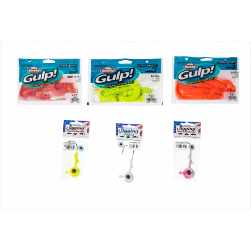 J&B Tackle CoA J&B Exclusive pack that includes three packages of our most popular 6" Gulp! grubs (Pink Shine, Chart, and Salmon Red) plus three JW ball jig...