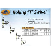 The Tsunami rolling "T" swivel is an easy tangle free way to put droppers on any bottom rig. Add as many swivels as you would like, one for each drop. The center swivel allows the dropper to swivel around the main line without tangles, provides better action to the bait. Available in 4 sizes