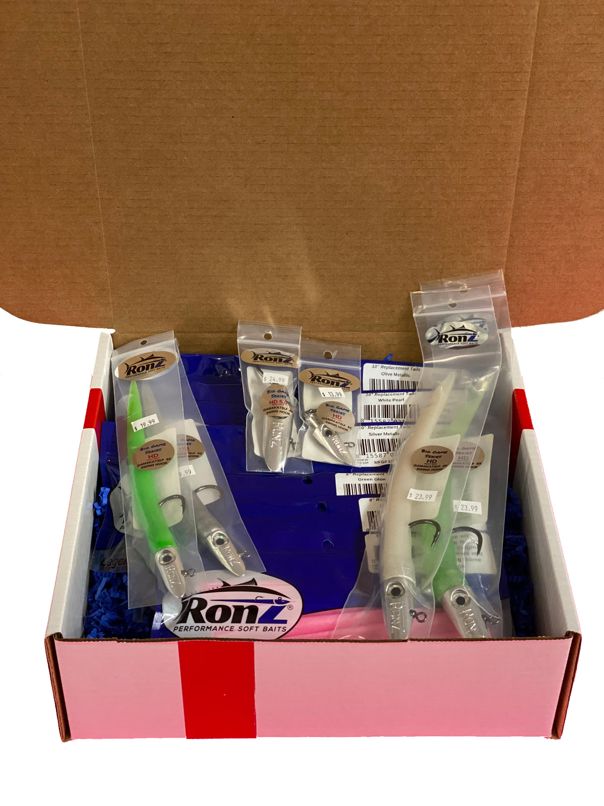 The best way to buy one of the most versatile and popular tuna casting and jigging lures on the market. The unique action of the RonZ tail hasn't been duplicated. This gift set includes (3) 10" replacement packs, (3) 8" replacement packs. 2 each 8" & 10" rigged baits as well as one replacement head in each size 8"& 10". 10" replacement head is the 5.0 new deep head!