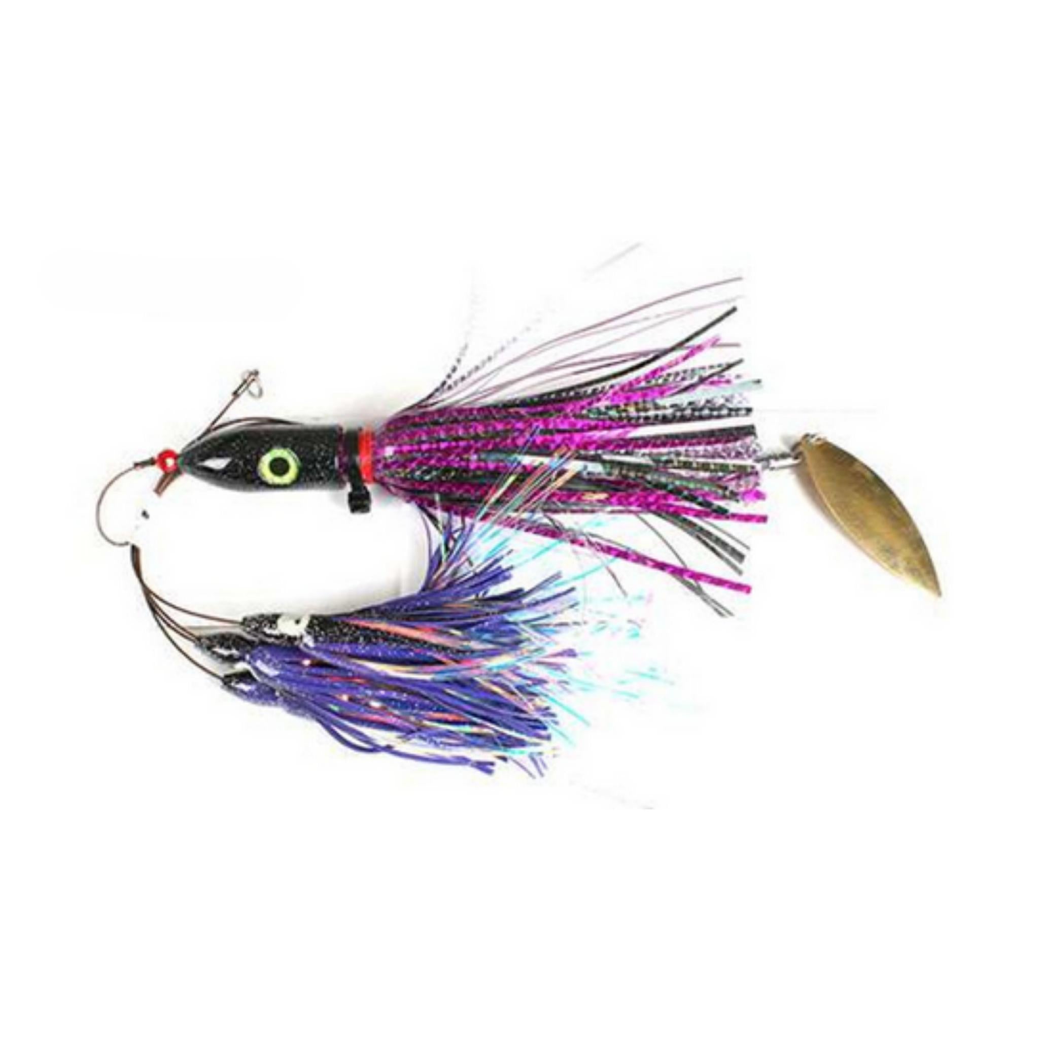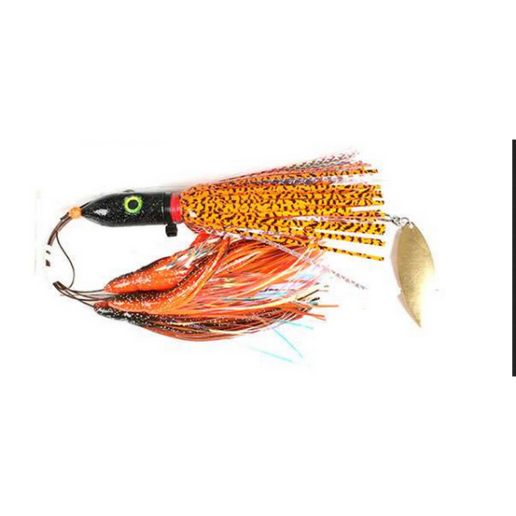 One of the latest innovations from Blue Water Candy, the JAG-A-HOO is possibly one of the most versatile offshore lures to hit the shelf. Based on the principle of a “Wahoo Bomb”, the JAG-A-HOO combines a trimmed down, compact version of Blue Water Candy’s most popular wahoo lures (JAG), and a large, gold spinner blade. Rigged on 275 lb. cable with an 9/0 Mustad® hook and terminated with a 900 lb. solid ring. The JAG-A-HOO is effective trolled both at slower and high speeds, from 5-12 kts. It also excels as a casting bait. The lure is held in place with a fixed crimp to ensure it does not slide up the leader, providing a perfect presentation each cast. Throw JAG-A-HOO to the horizon, let her sink, and crank like mad… you better be holding on!