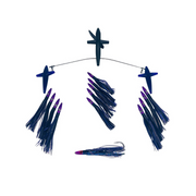 This 19-inch spreader bar is rigged with a patented side tracker bird and two outside stabilizing chatter birds to create strong surface commotion and a balanced trolling spread. It features thirteen 6-inch mini bullets in a 4-5-4 plus stinger configuration, along with free-spinning chatter birds on each teaser line for added noise and attraction. Built with heavy Momoi mono, diamond crimps, and chafe protection at critical points, it is designed for durability and consistent offshore performance. A premium 8/0 trolling hook stinger and mesh lure bag are included.