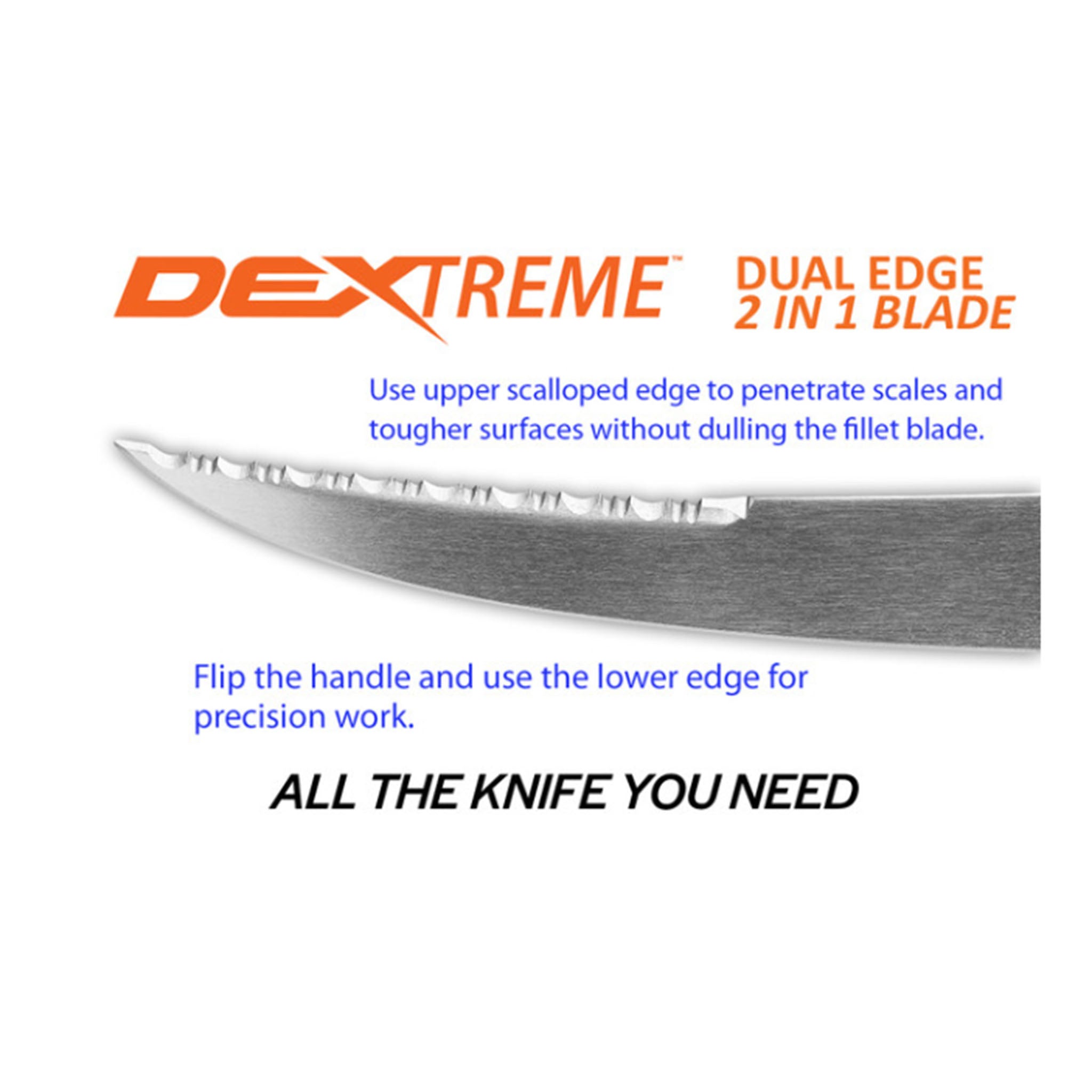Dextreme Dual Edge Knives were developed specifically for anglers, the all new Dextreme series features a 2-in-1 blade and an ergonomic handle engineered to deliver great cuts without compromises. The dual blade enables you to cut through scales without dulling the fillet blade for a more efficient fillet with just one knife. Sharp, flexible and durable, you’ll find this 2-in-1 knife is all the knife you need.
