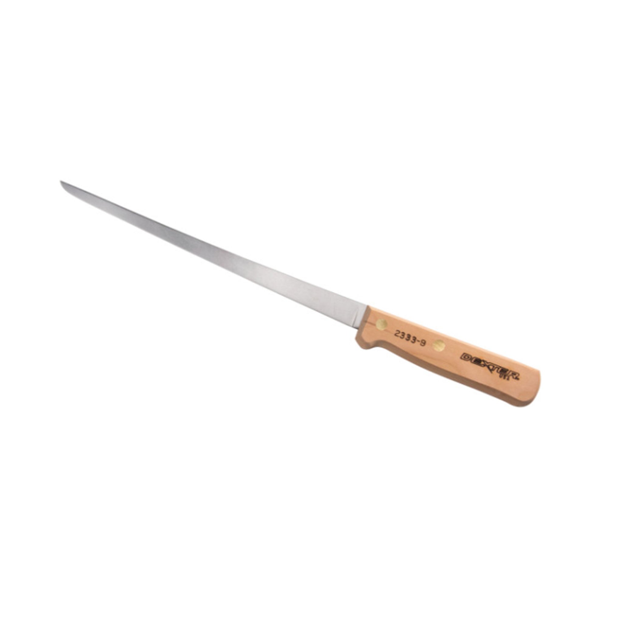 Preferred by many Charter Boat mates and Commercial fisherman the Traditional wooden handle high carbon steel knives are easy to sharpen and cut like a razor. High Carbon knives will rust quickly in a salt environment but can be cleaned up easily and ready for the next trip. J&B doesn't recommend these knives for most of our recreational fishermen. They are designed to be used almost daily or cared for every trip.