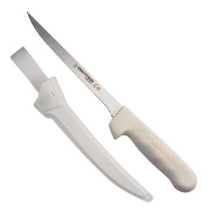 The Dexter S133-7 7" Fillet knife is famous for it's white Sani-Safe® handle. This is the knife every one tries to copy but can't come close to our durability, edge holding ability and performance. This knife features our Sani-Safe® handle and our proprietary High Carbon, High Alloy, Stain free DEXSTEEL. The Sani-Safe® handle gives you great control and the ultra sharp blade makes filleting easy. This knife is NSF certified. This fillet knife is available in 7",8" and 9" lengths. Made in U.S.A.